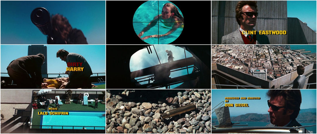 The opening sequence and credits to Don Siegel's Dirty Harry plays long, mean...and breathless? Cream-pie cool Clint Eastwood susses death and a devil atop skyscrapers to a tough Lalo Schifrin score. The soaring set piece sets your teeth on edge, the soft howl of wind an uncomfortable music, the framing tight and majestic. As the camera teeters on the executive producer credit you put your left arm around someone a little too tightly.